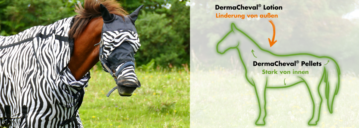 Für entspannte Sommer trotz erhöhter Insektenlast – mit DermaCheval® Pellets und Lotion unterstützen Sie die Pferdehaut ganzheitlich, von innen und außen.